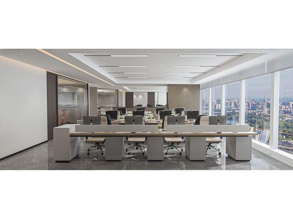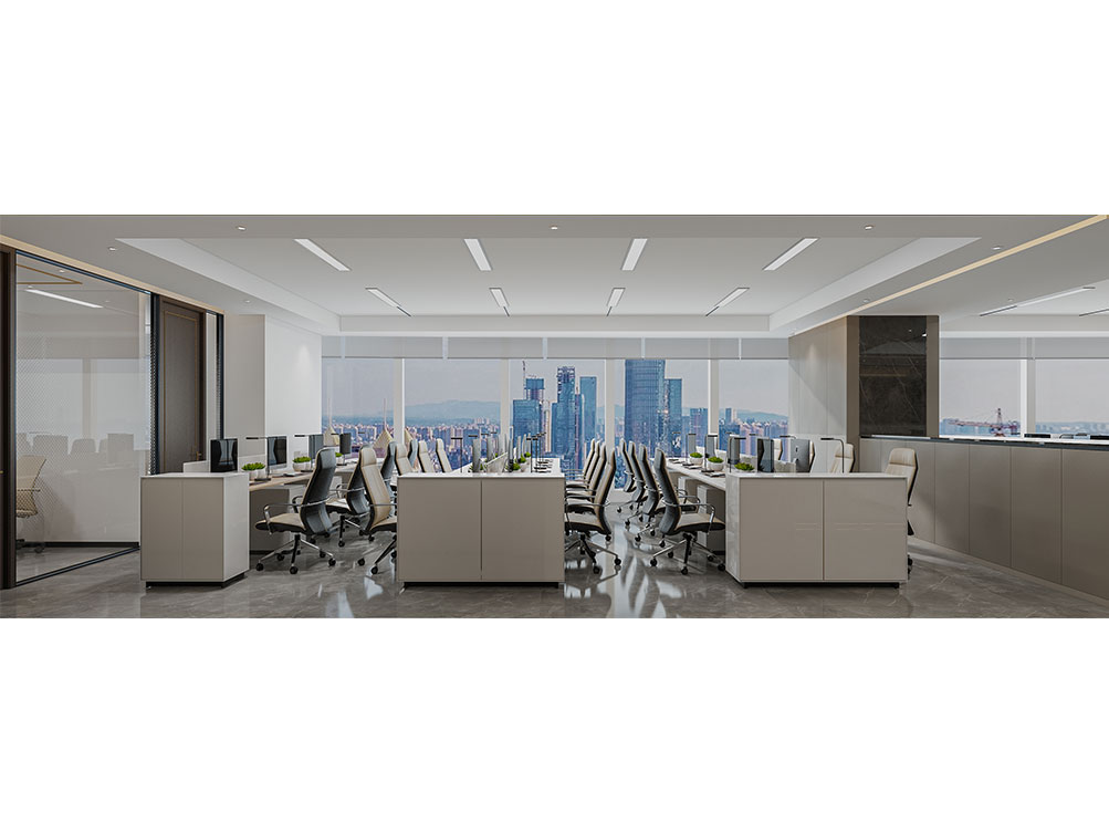 風(fēng)順集團(tuán)裝修效果以 “大氣沉穩(wěn) + 現(xiàn)代高效” 為核心,整體采用深灰、米白為主色調(diào)搭配金屬線條點(diǎn)綴,凸顯企業(yè)質(zhì)感。前臺(tái)接待區(qū)用大理石背景墻嵌入集團(tuán) LOGO,搭配簡(jiǎn)約大氣的接待臺(tái)與藝術(shù)擺件,營(yíng)造專業(yè)第一印象;濟(jì)南辦公室裝修為開(kāi)放辦公區(qū)采用模塊化工位設(shè)計(jì),配備獨(dú)立收納與人體工學(xué)座椅,墻面穿插集團(tuán)發(fā)展歷程掛畫(huà)與綠植,兼顧高效與舒適;會(huì)議室按規(guī)模配置高清會(huì)議系統(tǒng)與吸音材質(zhì),滿足不同商務(wù)需求;同時(shí)預(yù)留休閑茶水區(qū)與榮譽(yù)展示墻,既方便員工放松,也直觀傳遞企業(yè)實(shí)力,整體空間兼具品牌形象與實(shí)用功能。