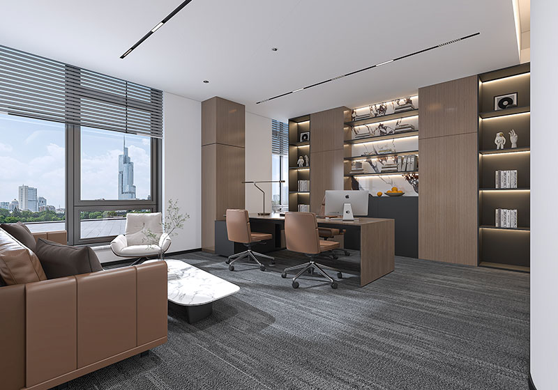作為濟南辦公室裝修中高管辦公空間的代表,捷島辦公室以暖棕木調淺灰地毯鋪陳質感:辦公區(qū)搭配人體工學椅適配高效工作,休閑沙發(fā)區(qū)兼顧接待功能,嵌入式展示柜氛圍燈點綴細節(jié),大窗引城市景觀,既契合濟南辦公室裝修商務屬性舒適體驗的需求,也以輕奢風格彰顯企業(yè)高階辦公調性,是濟南高端辦公室裝修的典型范本。