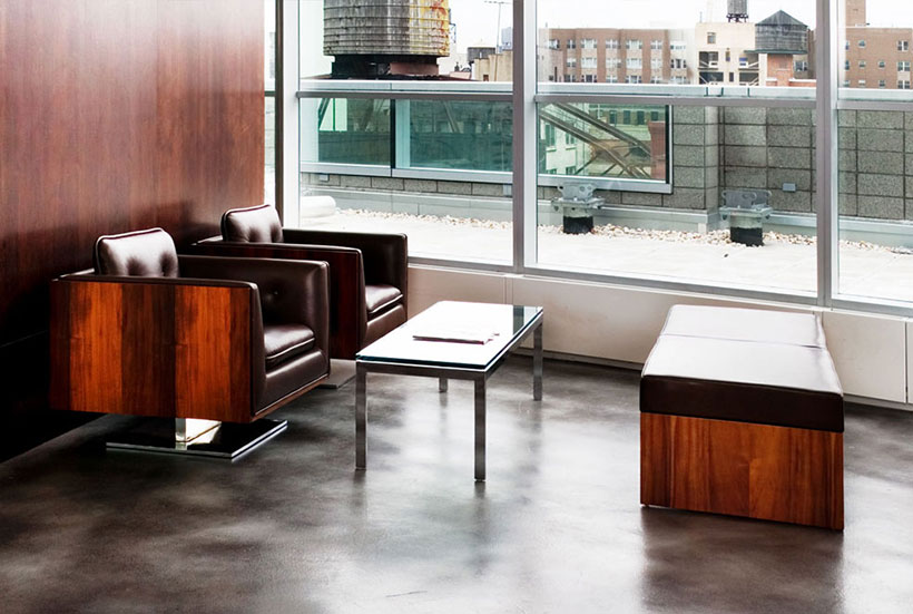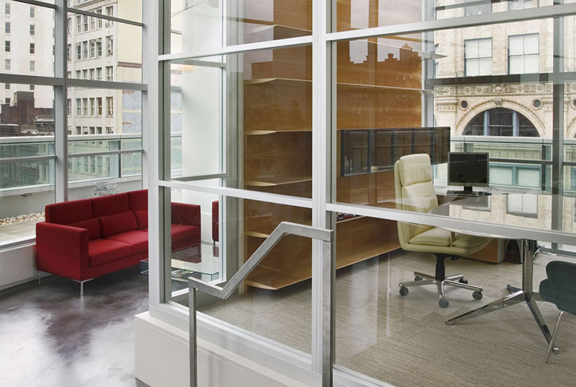 會(huì)議室里的人字形地毯條紋地毯在交易大廳是傳統(tǒng)的男裝衣料的當(dāng)代借鑒。有木鑲板在辦公室,但在歐洲輕型核桃,用干凈的細(xì)節(jié)。