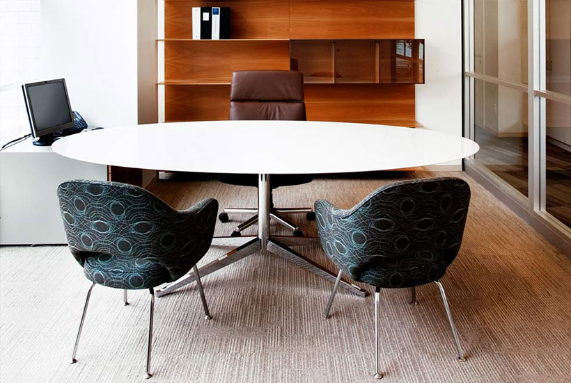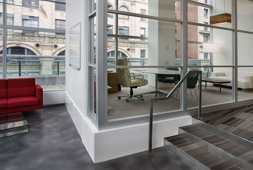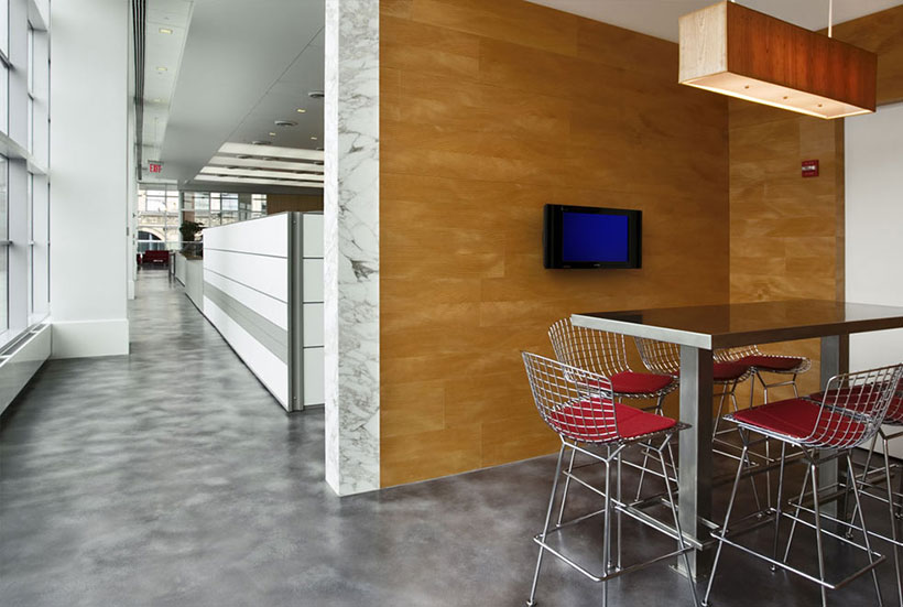 代替?zhèn)鹘y(tǒng)的木材交易桌,我們設(shè)計(jì)了白色的蝕刻的玻璃臺(tái)面的鋼框架桌子。接待和會(huì)議區(qū)結(jié)合核桃鑲板和書有彩色混凝土地板和白色的石膏在前臺(tái)配合大理石。